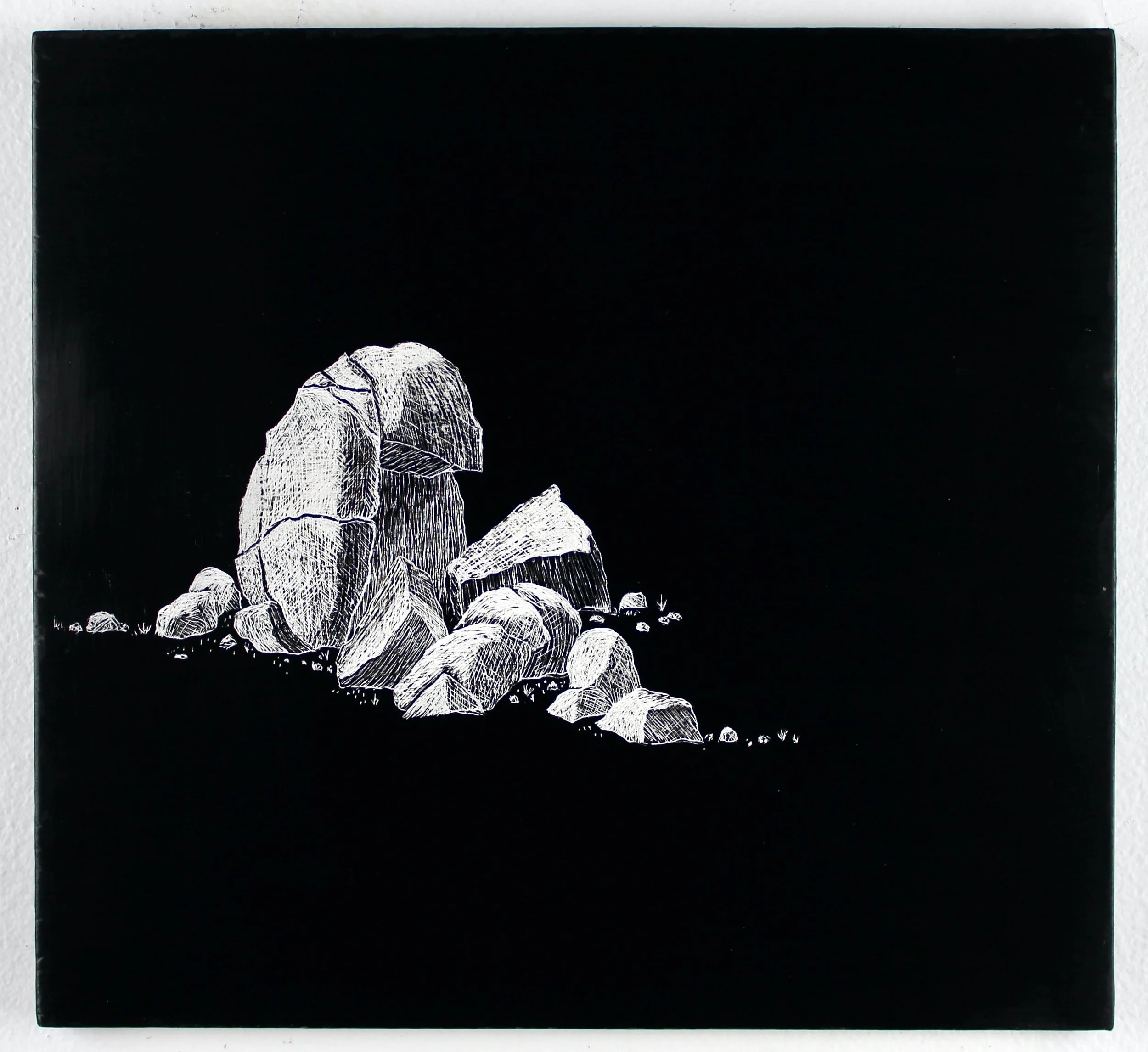 Based on pencil and paper field drawings done during the project, the rocks depicted in each panel represent landmarks used when navigating the area of exploration. The material - cera colla - is the same cold wax medium used in the panels (see below) left outside at BoxoPROJECTS from 2022 - 2025.