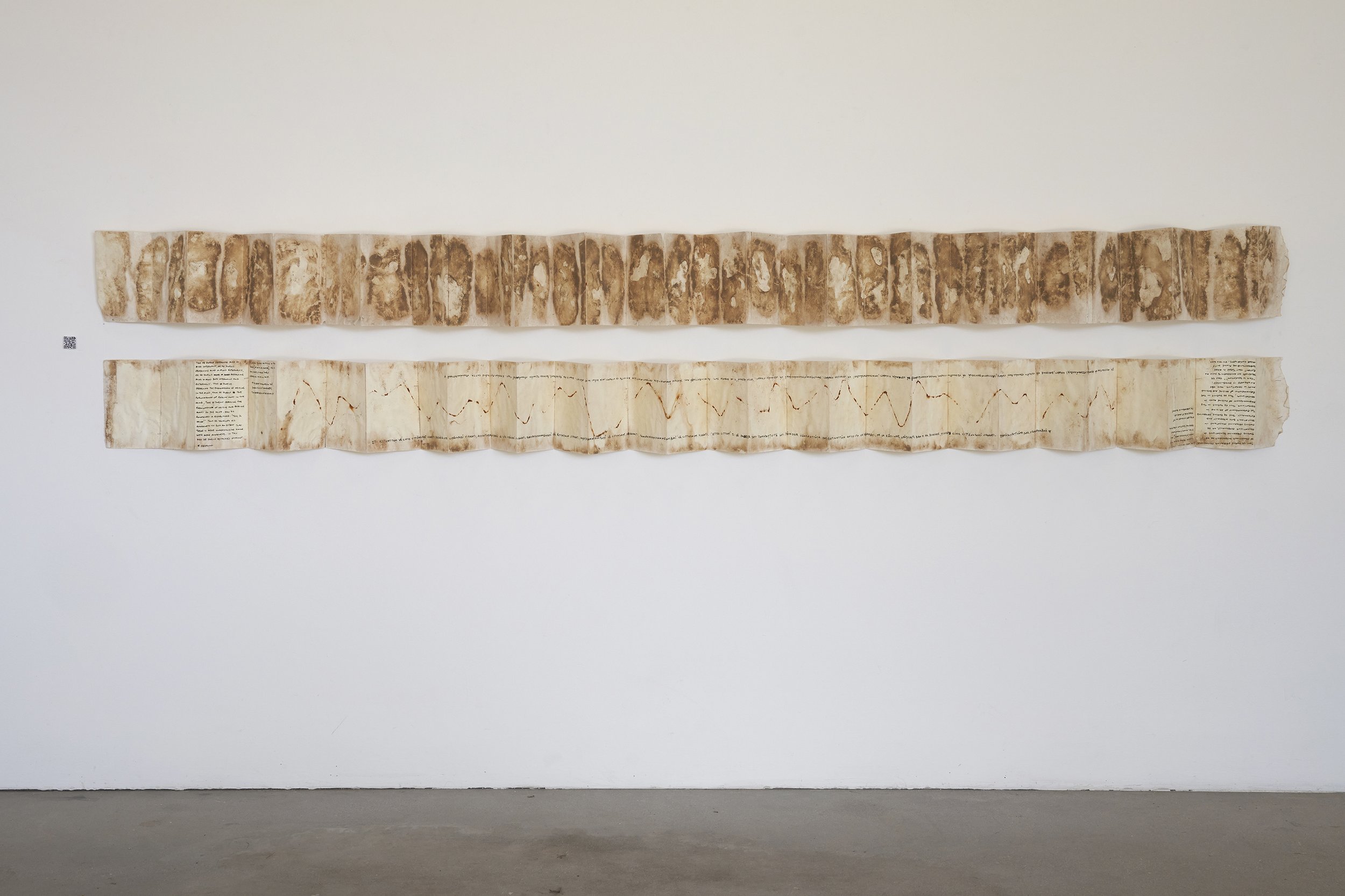 Installed in 2020 and retrieved in 2022, a host of regular brick-shaped rocks found at this remote site in the Mojave compressed two outstretched accordion books coated with tea and laid face-to-face against a piece of wire sculpted into a pattern reminiscent of the rising & falling contours of the surrounding mountains.