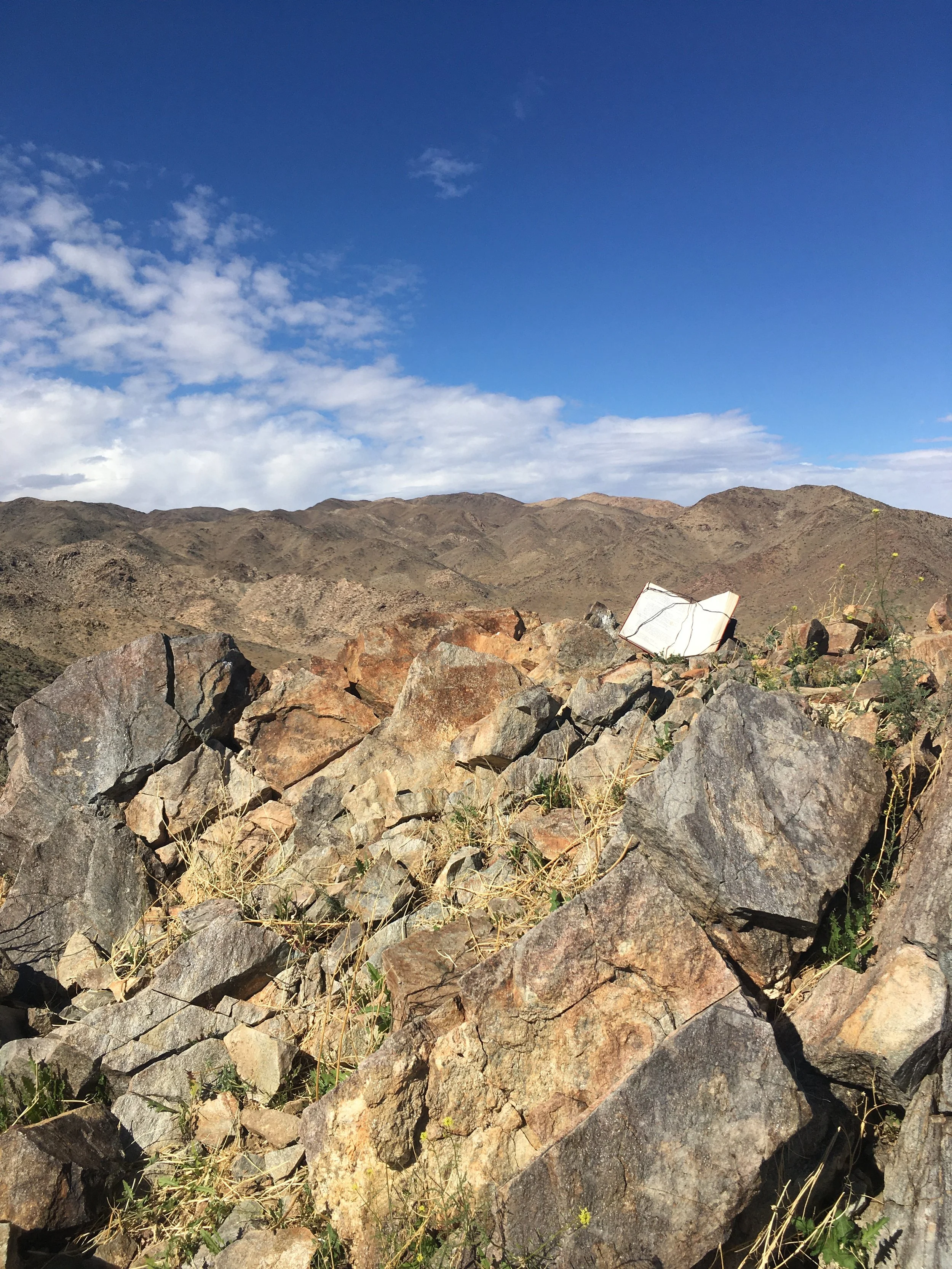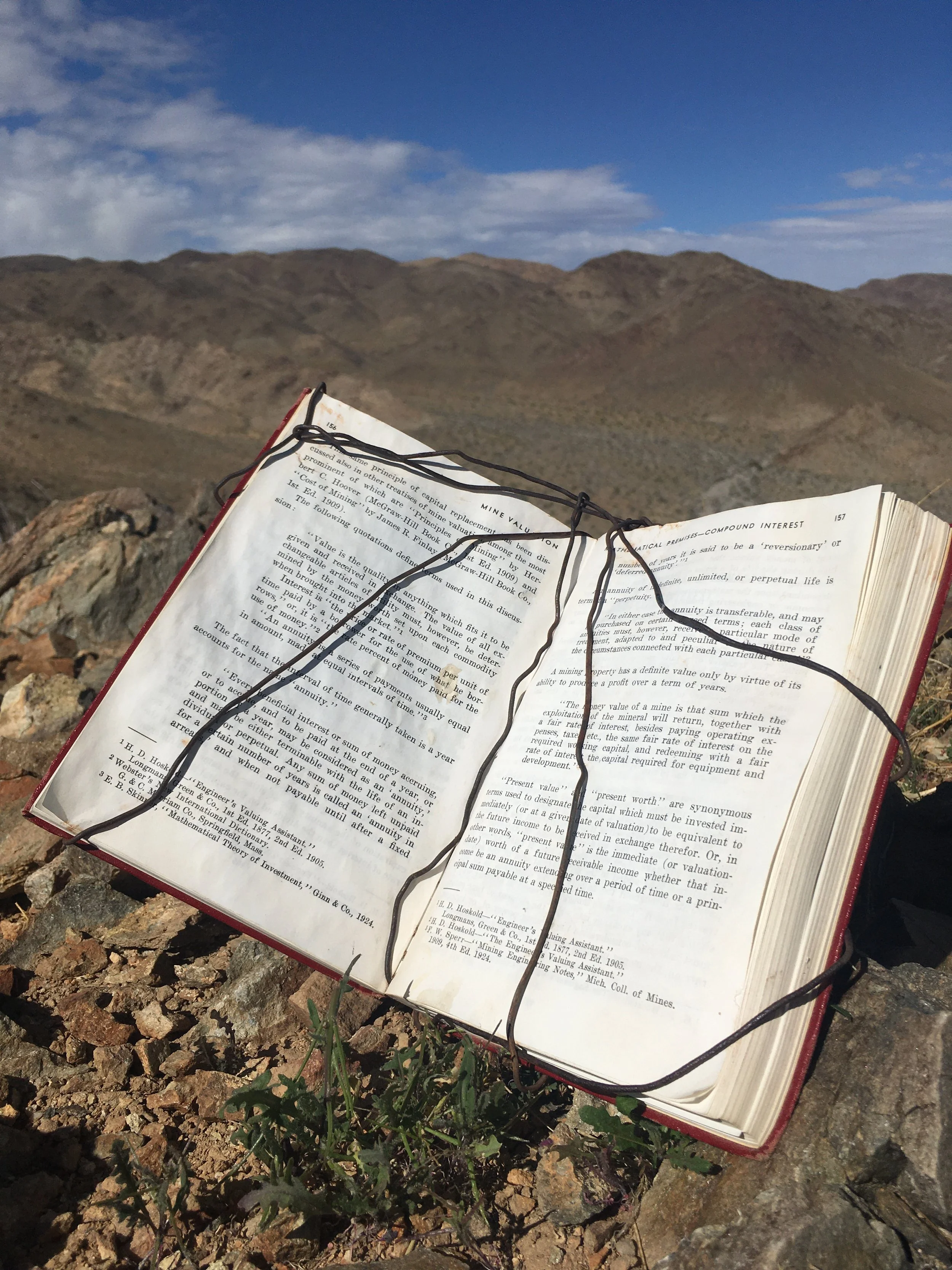 Bound to a rock cradle found atop an anonymous peak in the former mining district of the Hexie Mountains, Southern California, Examination and Valuation of Mineral Property (Addison-Wesley Press, 1949) charts the ever-changing social values as the nearby Golden Bell mining claim now functions as tourist attraction. After two years, the installation was dismantled, the book-shaped cradle which prompted the gesture continues to bear witness to the changing social and environmental dynamics of the site at large.